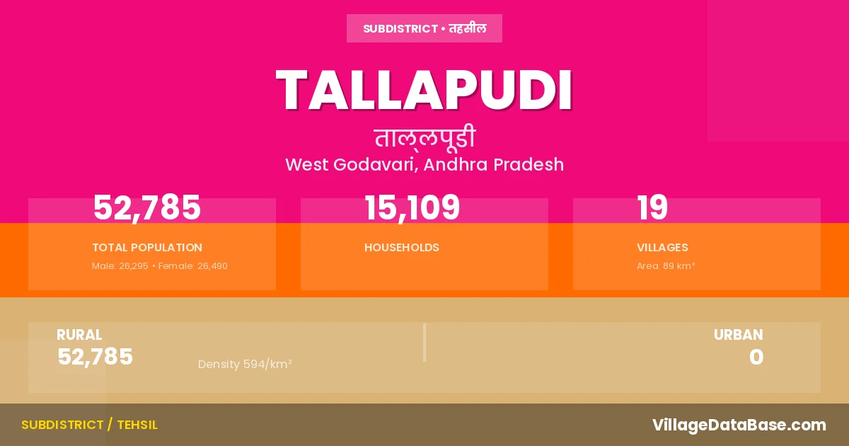 According to the 2011 census The total area of Tallapudi Mandal is 89 km², with a population of 52785 people. The population density is 594 inhabitants per square kilometre, and there are approximately 15109 houses in the sub district.