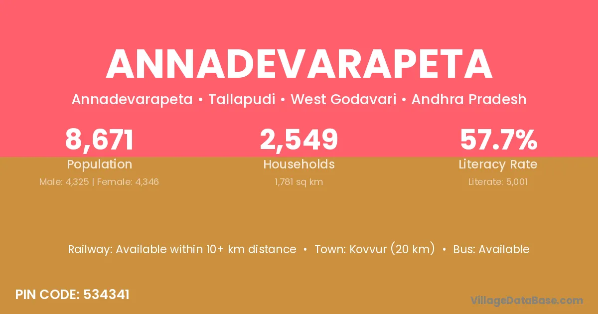 Annadevarapeta village has a total population of 8,671 people, of which 4,325 are males and 4,346 are females.