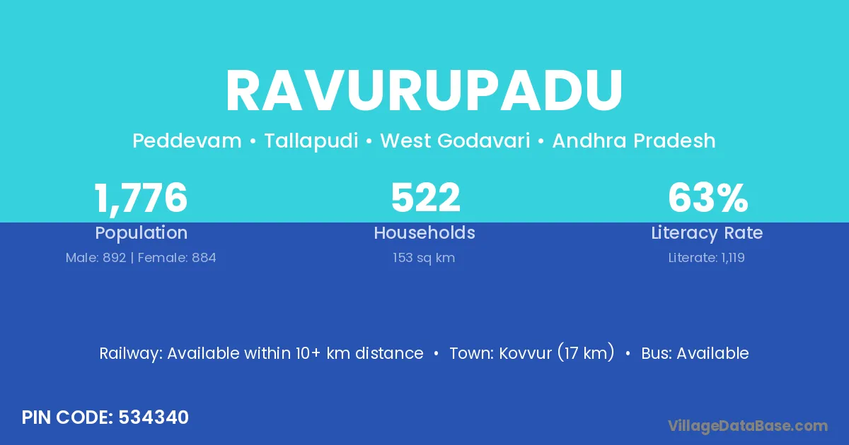 Kovvur (17 km) is the nearest town to Ravurupadu village for major economic activities and is located approximately 17 km away.