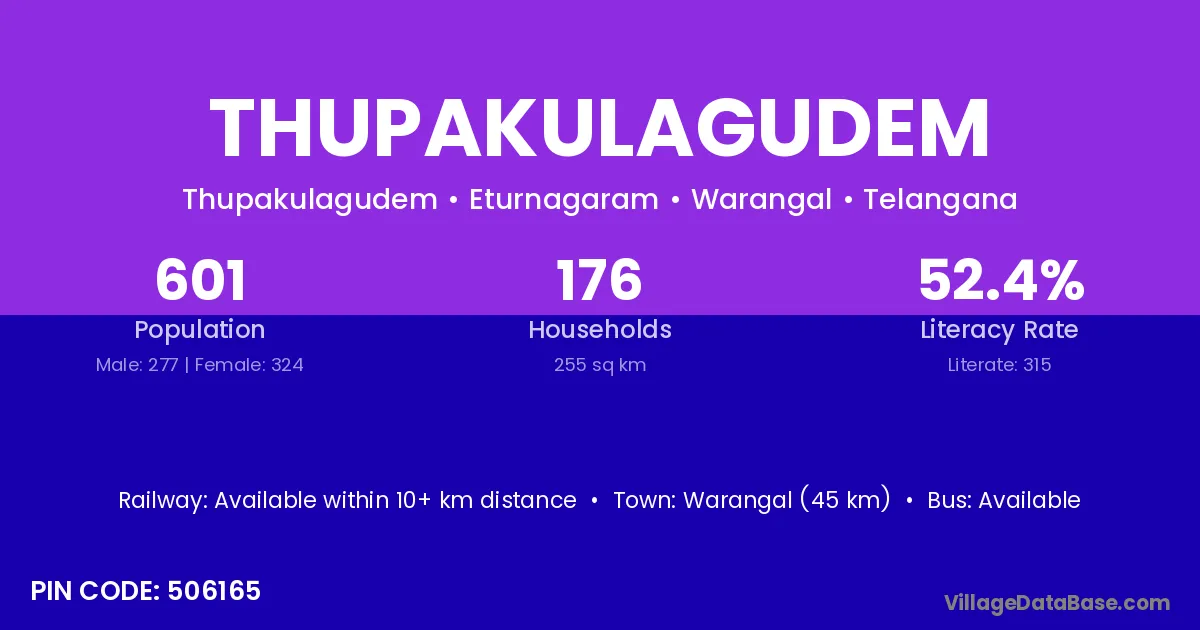 Thupakulagudem village has a total population of 1,078 people, of which 546 are males and 532 are females.