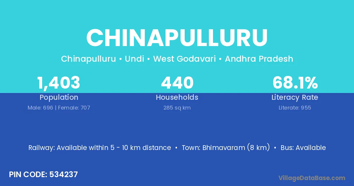 Bhimavaram (8 km) is the nearest town to Chinapulluru village for major economic activities and is located approximately 8 km away.