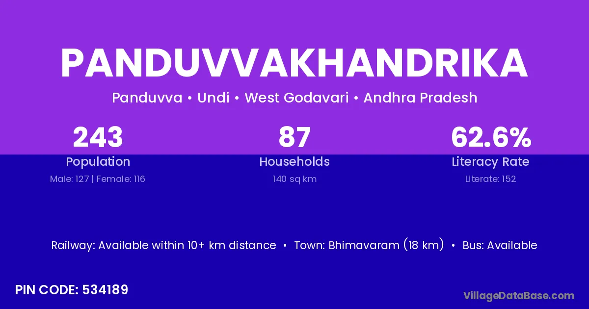Bhimavaram (18 km) is the nearest town to Panduvvakhandrika village for major economic activities and is located approximately 18 km away.