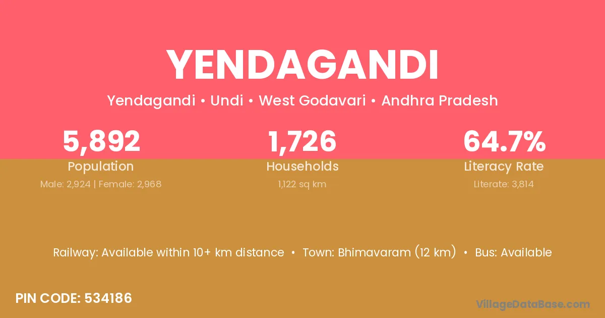 Bhimavaram (12 km) is the nearest town to Yendagandi village for major economic activities and is located approximately 12 km away.
