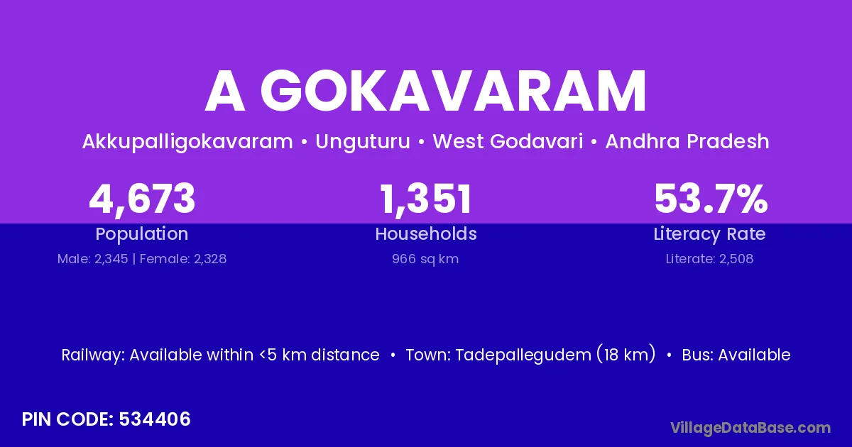 Tadepallegudem (18 km) is the nearest town to A Gokavaram village for major economic activities and is located approximately 18 km away.