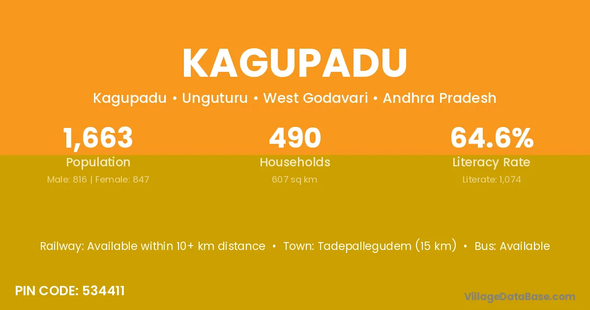 Tadepallegudem (15 km) is the nearest town to Kagupadu village for major economic activities and is located approximately 15 km away.