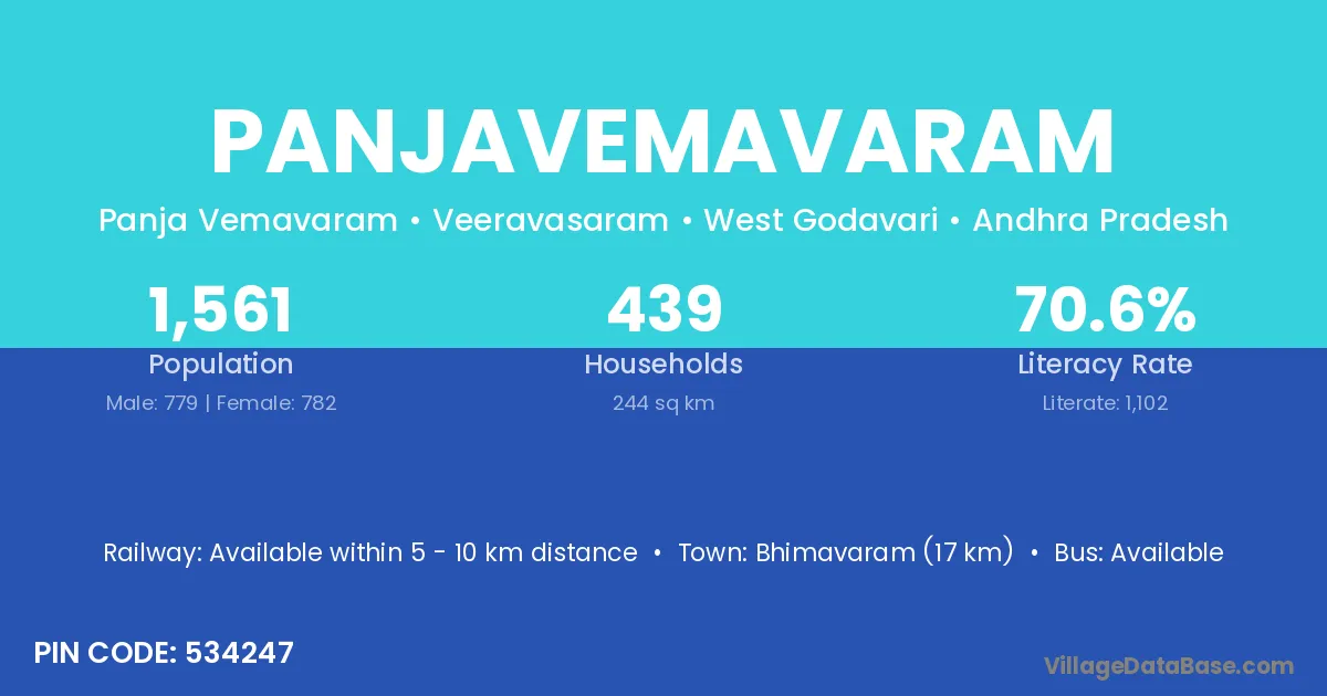 Bhimavaram (17 km) is the nearest town to Panjavemavaram village for major economic activities and is located approximately 17 km away.