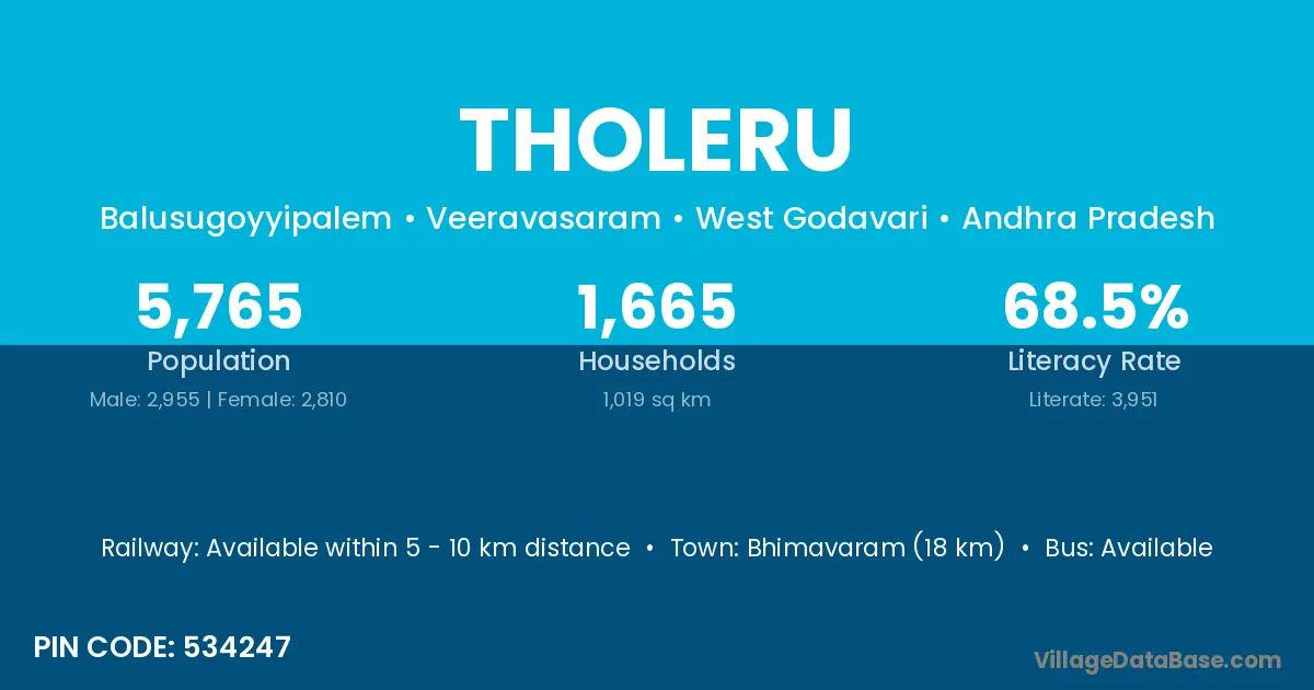 Bhimavaram (18 km) is the nearest town to Tholeru village for major economic activities and is located approximately 18 km away.