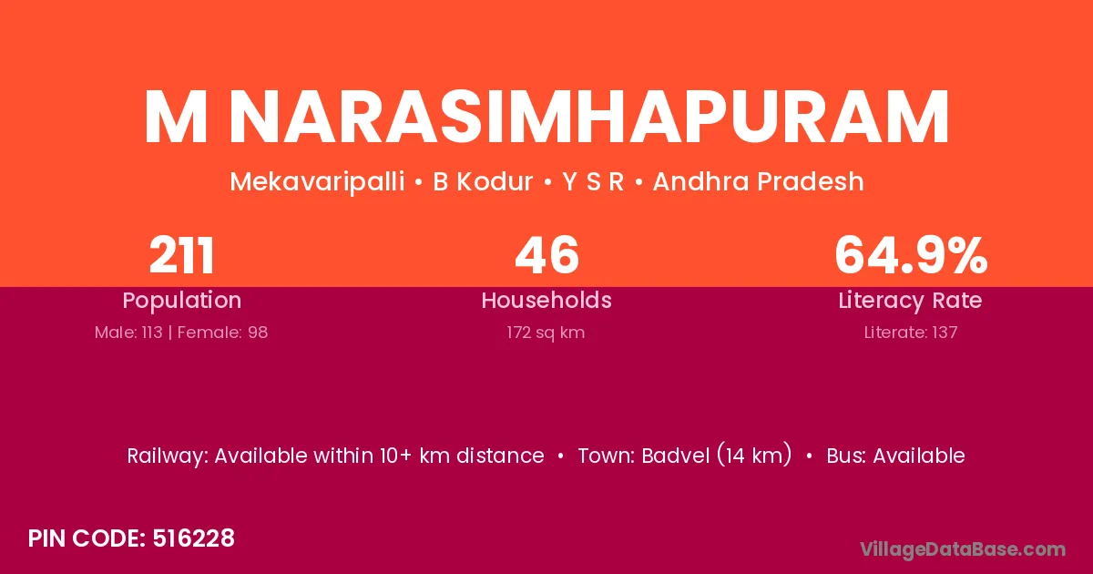 M Narasimhapuram village has a total population of 211 people, of which 113 are males and 98 are females.