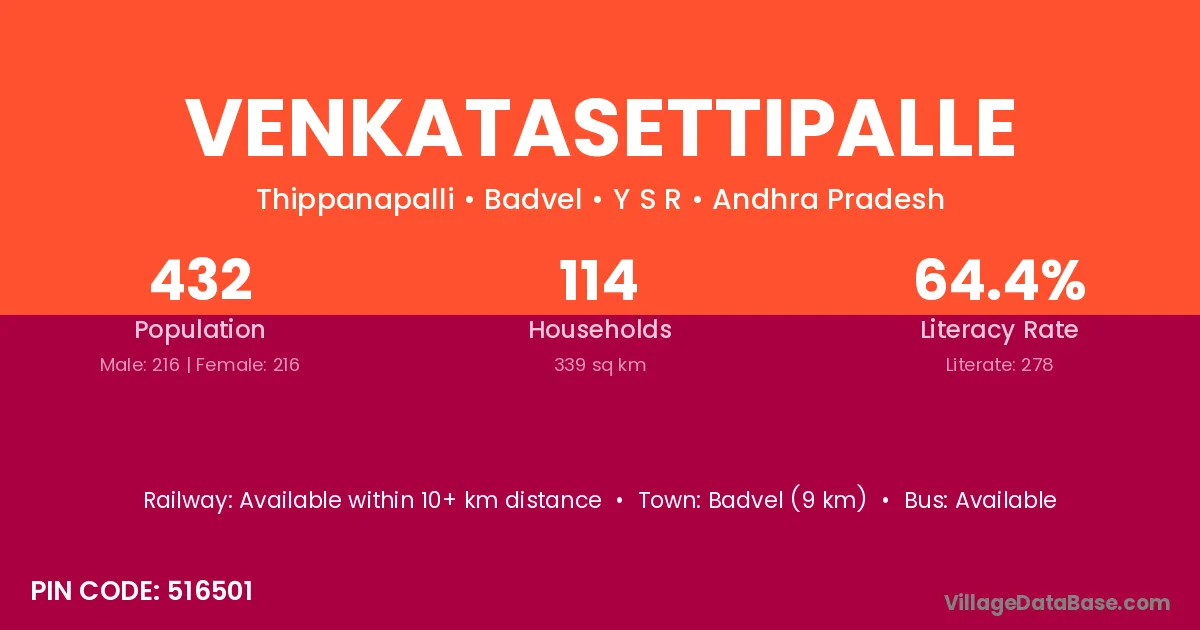 Venkatasettipalle village has a total population of 432 people, of which 216 are males and 216 are females.