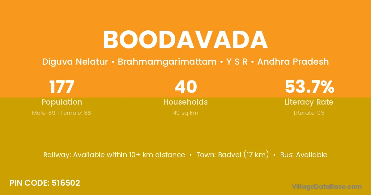 Badvel (17 km) is the nearest town to Boodavada village for major economic activities and is located approximately 17 km away.
