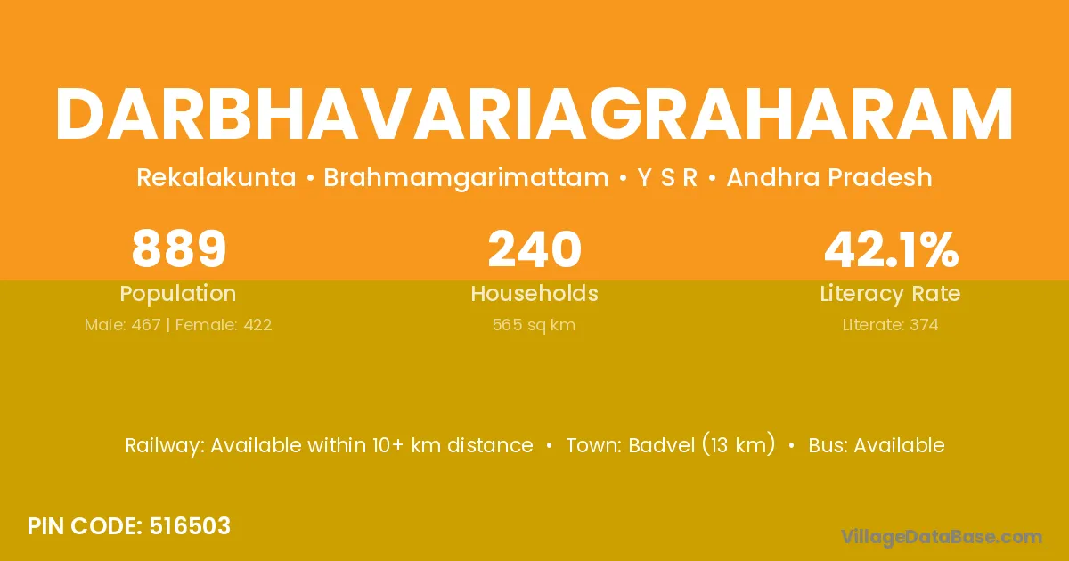 Badvel (13 km) is the nearest town to Darbhavariagraharam village for major economic activities and is located approximately 13 km away.