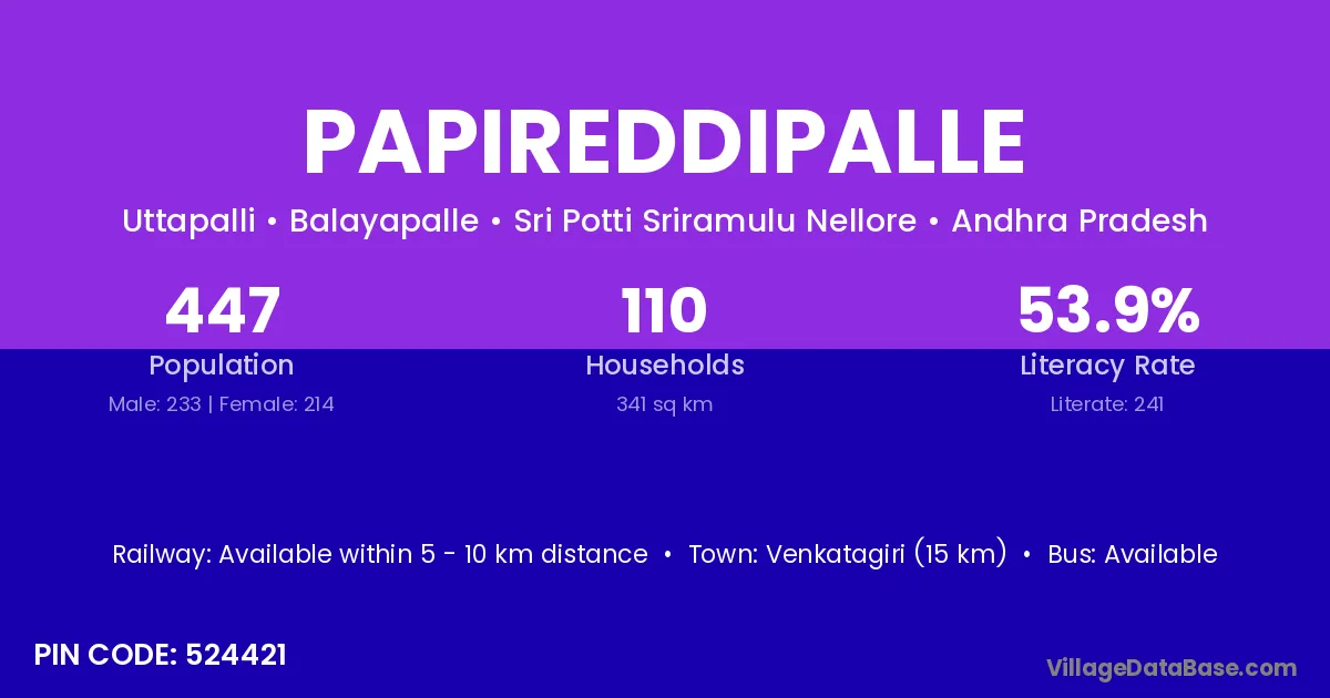 The literacy rate of Papireddipalle village is 48.63%. Male literacy stands at 57.56% and female literacy at 39.49%.