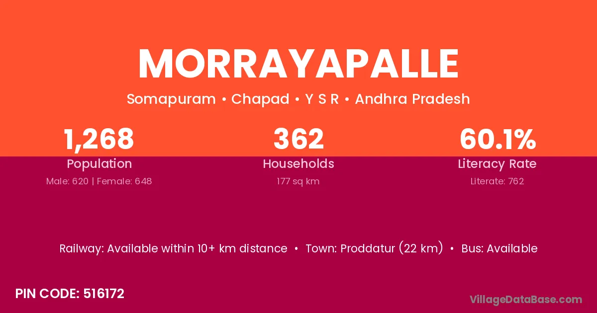 Morrayapalle village has a total population of 1,268 people, of which 620 are males and 648 are females.