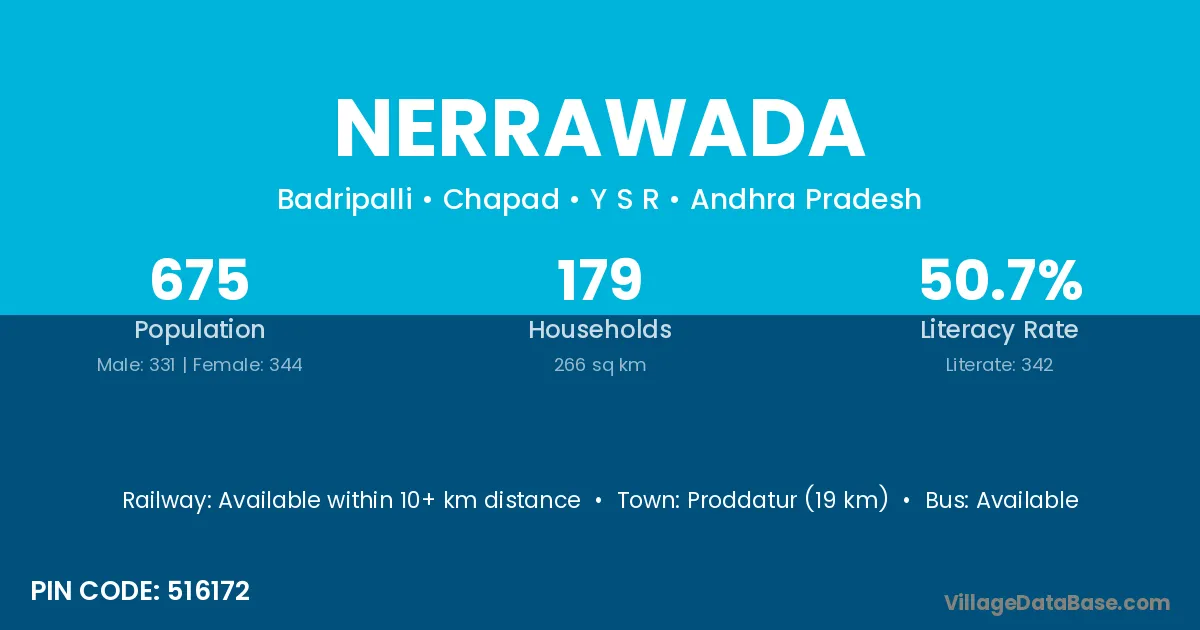 Proddatur (19 km) is the nearest town to Nerrawada village for major economic activities and is located approximately 19 km away.