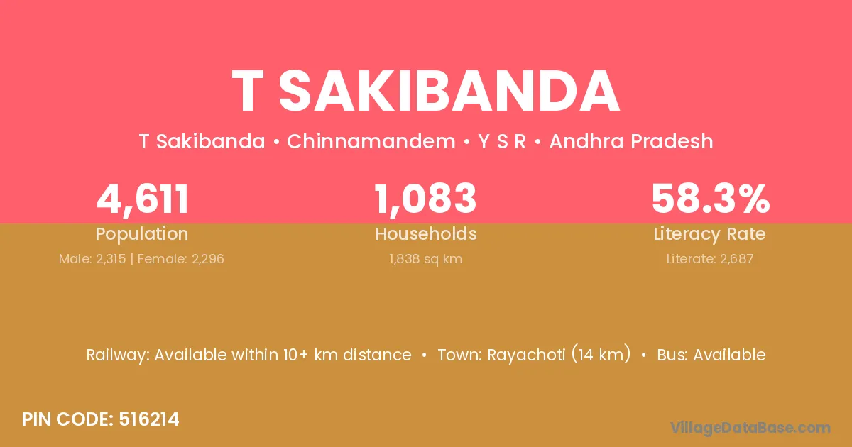 Rayachoti (14 km) is the nearest town to T Sakibanda village for major economic activities and is located approximately 14 km away.