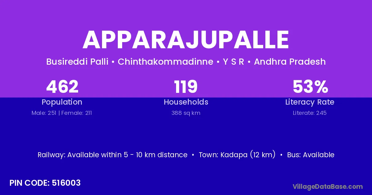 Apparajupalle village has a total population of 462 people, of which 251 are males and 211 are females.