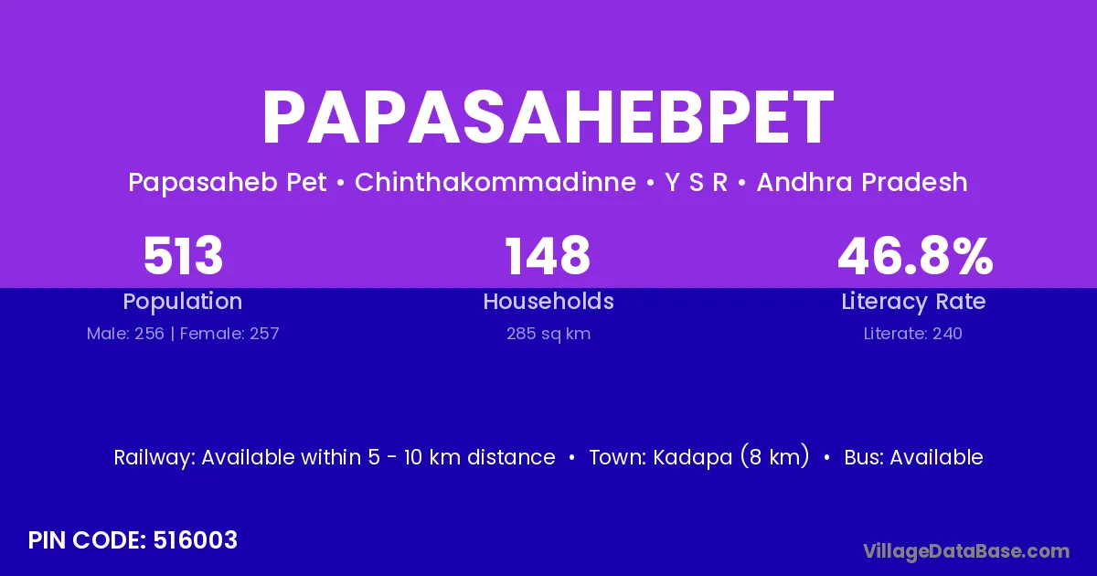 Papasahebpet village has a total population of 513 people, of which 256 are males and 257 are females.