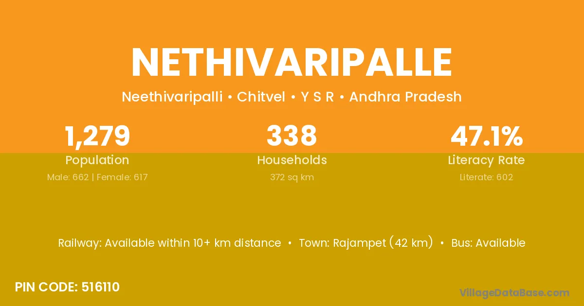 Rajampet (42 km) is the nearest town to Nethivaripalle village for major economic activities and is located approximately 42 km away.
