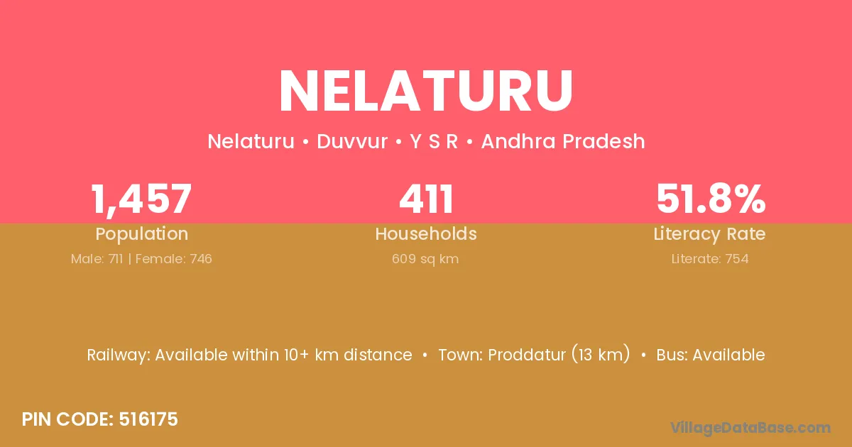 Proddatur (13 km) is the nearest town to Nelaturu village for major economic activities and is located approximately 13 km away.