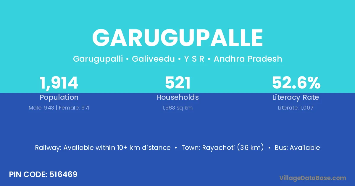 Rayachoti (36 km) is the nearest town to Garugupalle village for major economic activities and is located approximately 36 km away.