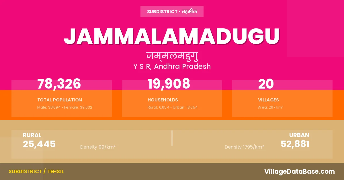 According to the 2011 census The total area of Jammalamadugu Mandal is 287 km², with a population of 78326 people. The population density is 273 inhabitants per square kilometre, and there are approximately 19908 houses in the sub district.