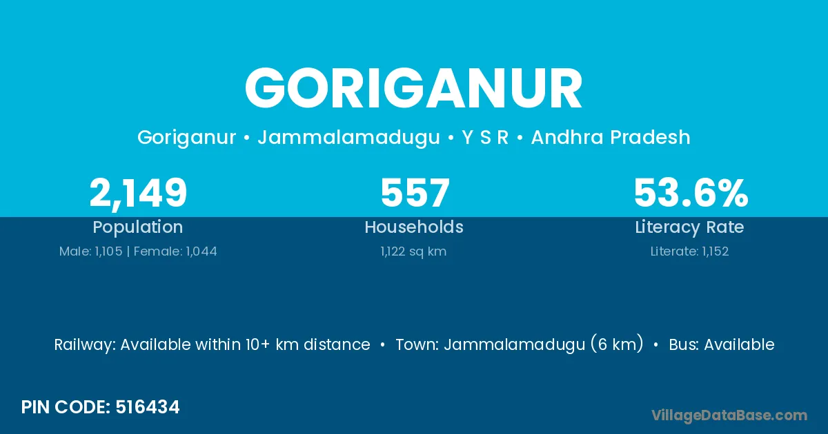 Jammalamadugu (6 km) is the nearest town to Goriganur village for major economic activities and is located approximately 6 km away.