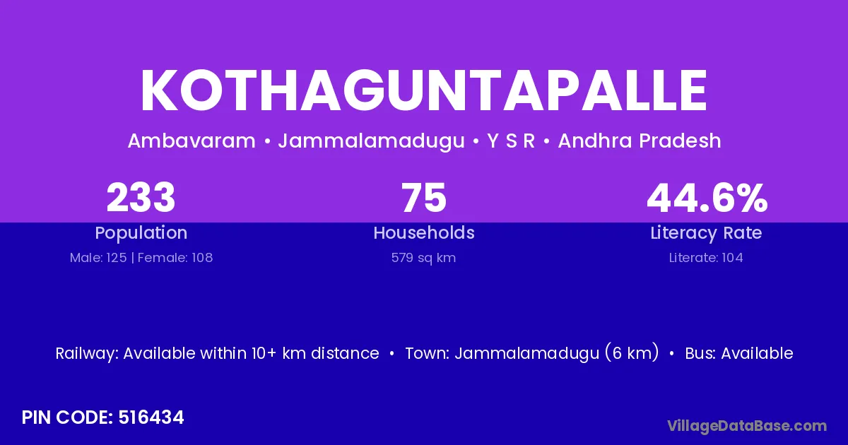 Jammalamadugu (6 km) is the nearest town to Kothaguntapalle village for major economic activities and is located approximately 6 km away.