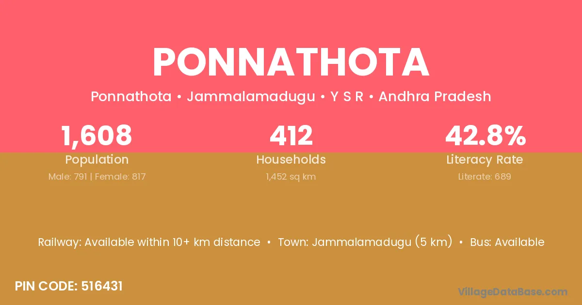 Jammalamadugu (5 km) is the nearest town to Ponnathota village for major economic activities and is located approximately 5 km away.