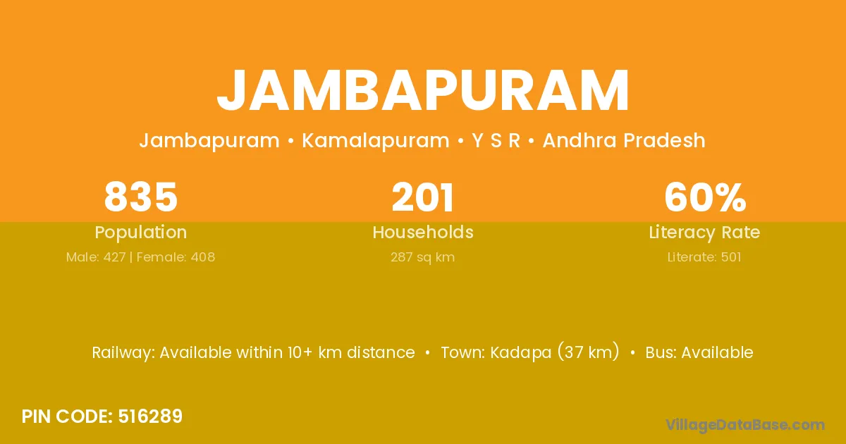 Kadapa (37 km) is the nearest town to Jambapuram village for major economic activities and is located approximately 37 km away.