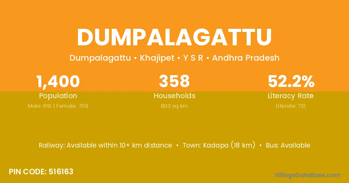 Kadapa (18 km) is the nearest town to Dumpalagattu village for major economic activities and is located approximately 18 km away.