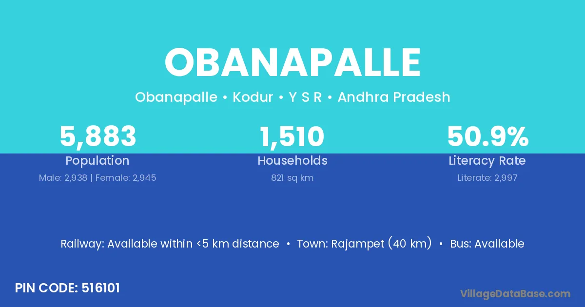 Rajampet (40 km) is the nearest town to Obanapalle village for major economic activities and is located approximately 40 km away.