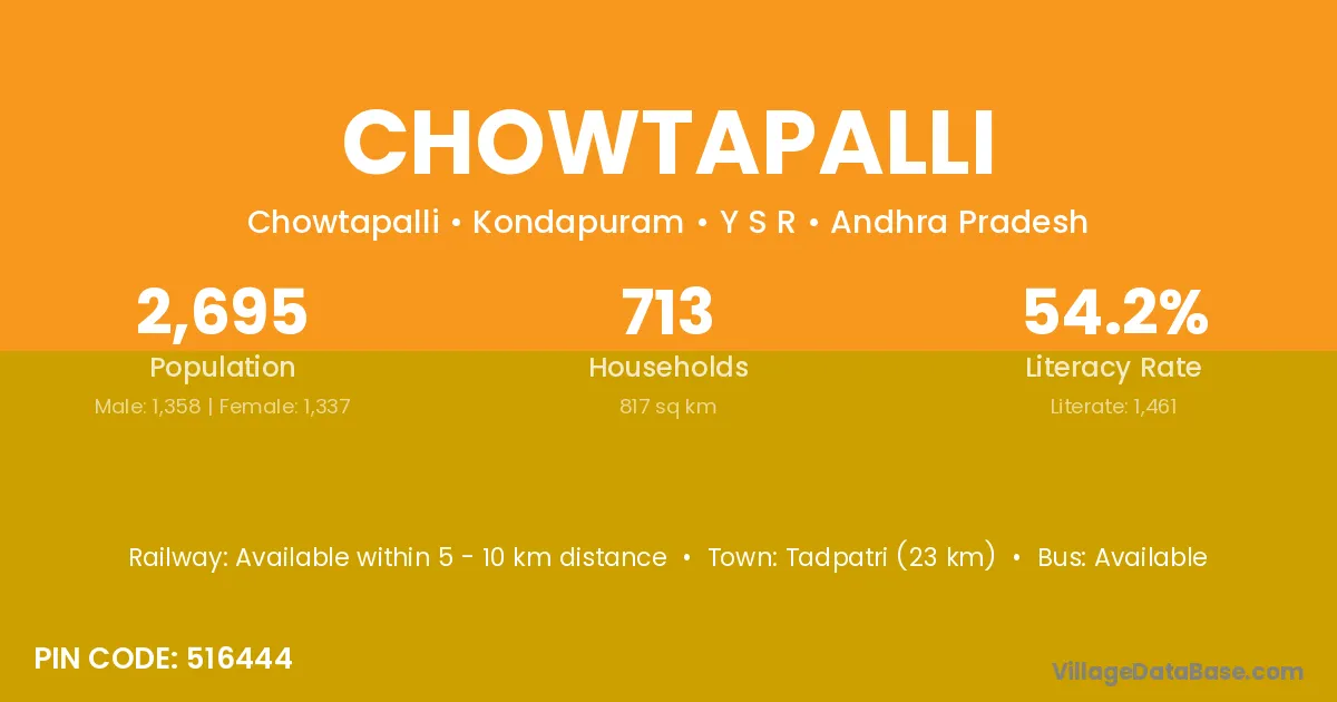 Tadpatri (23 km) is the nearest town to Chowtapalli village for major economic activities and is located approximately 23 km away.
