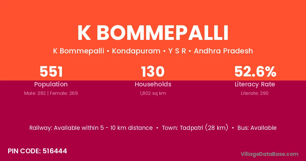 Tadpatri (28 km) is the nearest town to K Bommepalli village for major economic activities and is located approximately 28 km away.