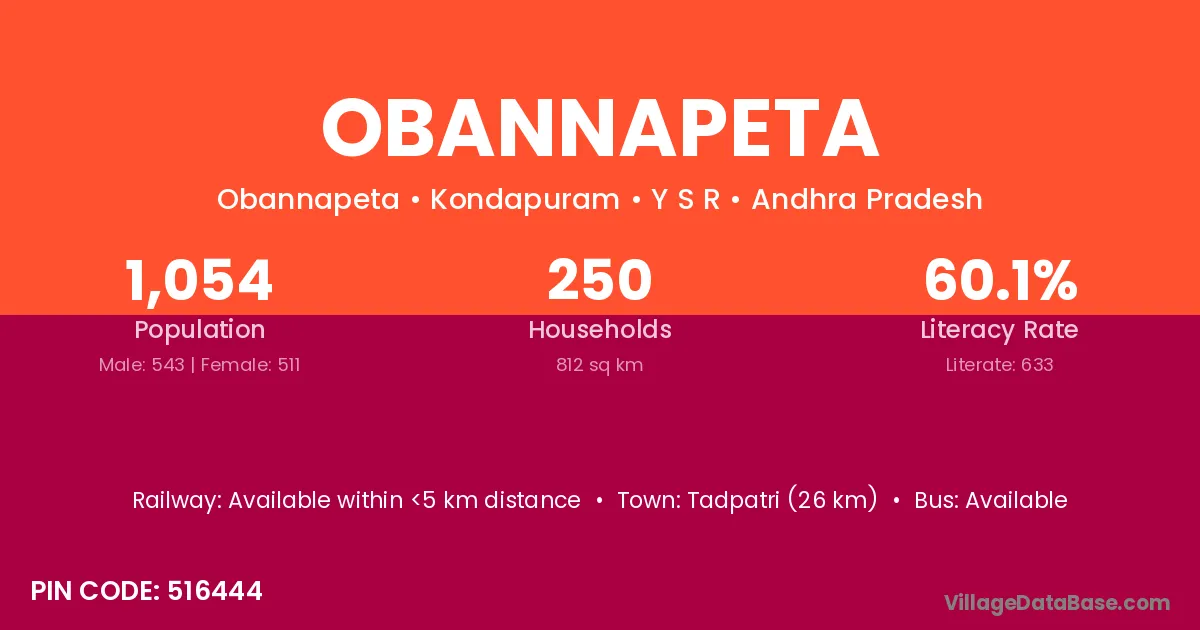 Tadpatri (26 km) is the nearest town to Obannapeta village for major economic activities and is located approximately 26 km away.