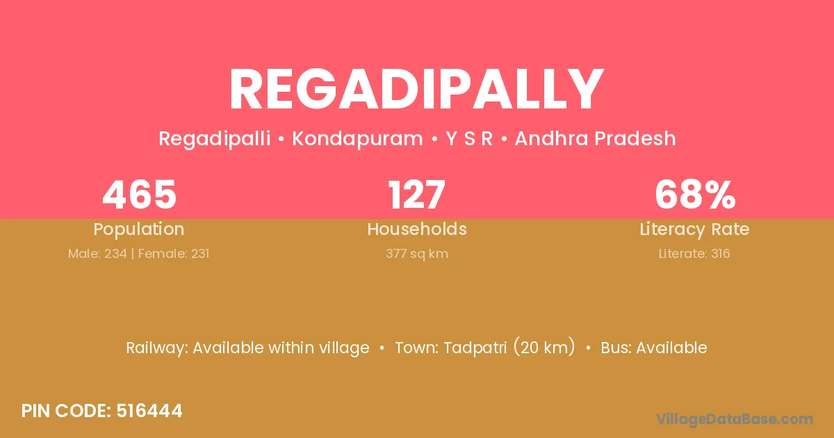 According to Census 2011 information, the village code of Regadipally village is 516444.