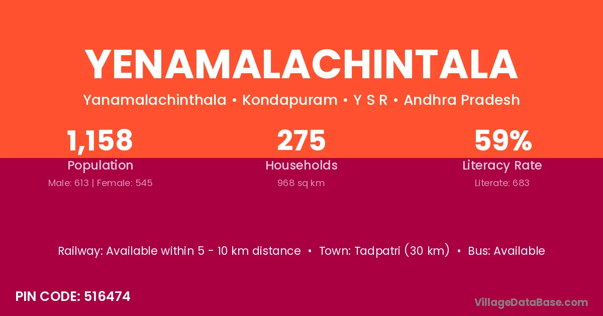 Tadpatri (30 km) is the nearest town to Yenamalachintala village for major economic activities and is located approximately 30 km away.