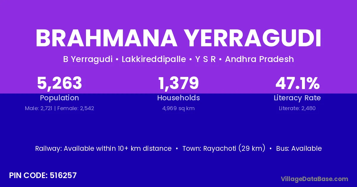 Rayachoti (29 km) is the nearest town to Brahmana Yerragudi village for major economic activities and is located approximately 29 km away.