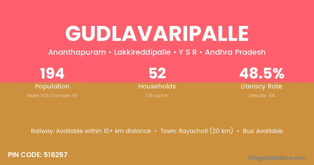 Rayachoti (20 km) is the nearest town to Gudlavaripalle village for major economic activities and is located approximately 20 km away.