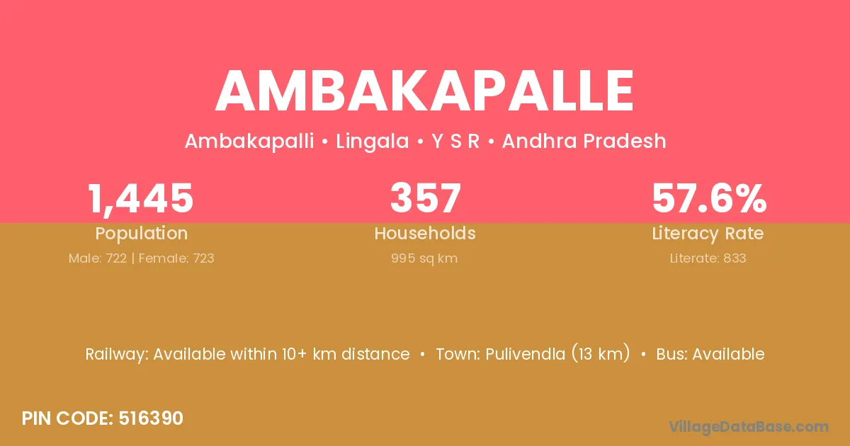 Pulivendla (13 km) is the nearest town to Ambakapalle village for major economic activities and is located approximately 13 km away.