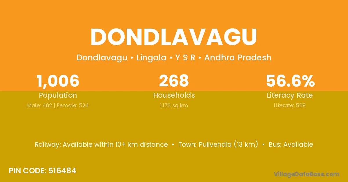 Dondlavagu village has a total population of 1,006 people, of which 482 are males and 524 are females.