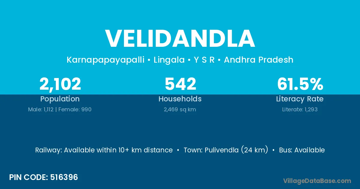Pulivendla (24 km) is the nearest town to Velidandla village for major economic activities and is located approximately 24 km away.