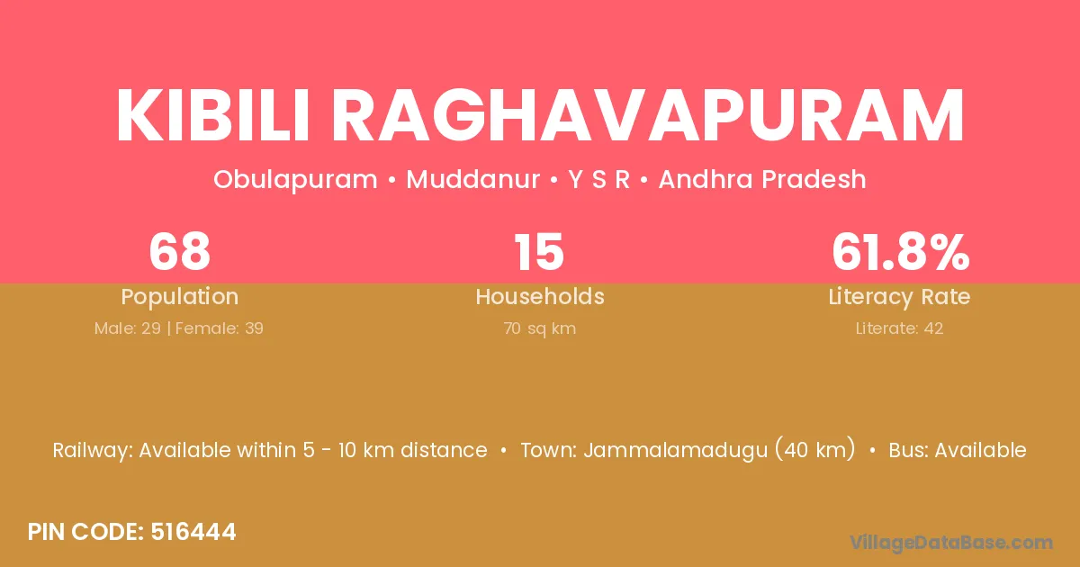 Jammalamadugu (40 km) is the nearest town to Kibili Raghavapuram village for major economic activities and is located approximately 40 km away.