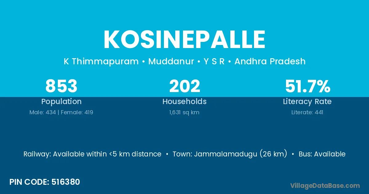 Kosinepalle village has a total population of 853 people, of which 434 are males and 419 are females.