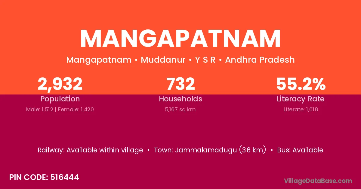 Jammalamadugu (36 km) is the nearest town to Mangapatnam village for major economic activities and is located approximately 36 km away.