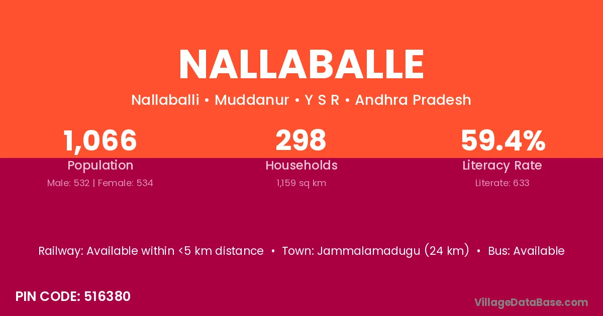 Jammalamadugu (24 km) is the nearest town to Nallaballe village for major economic activities and is located approximately 24 km away.