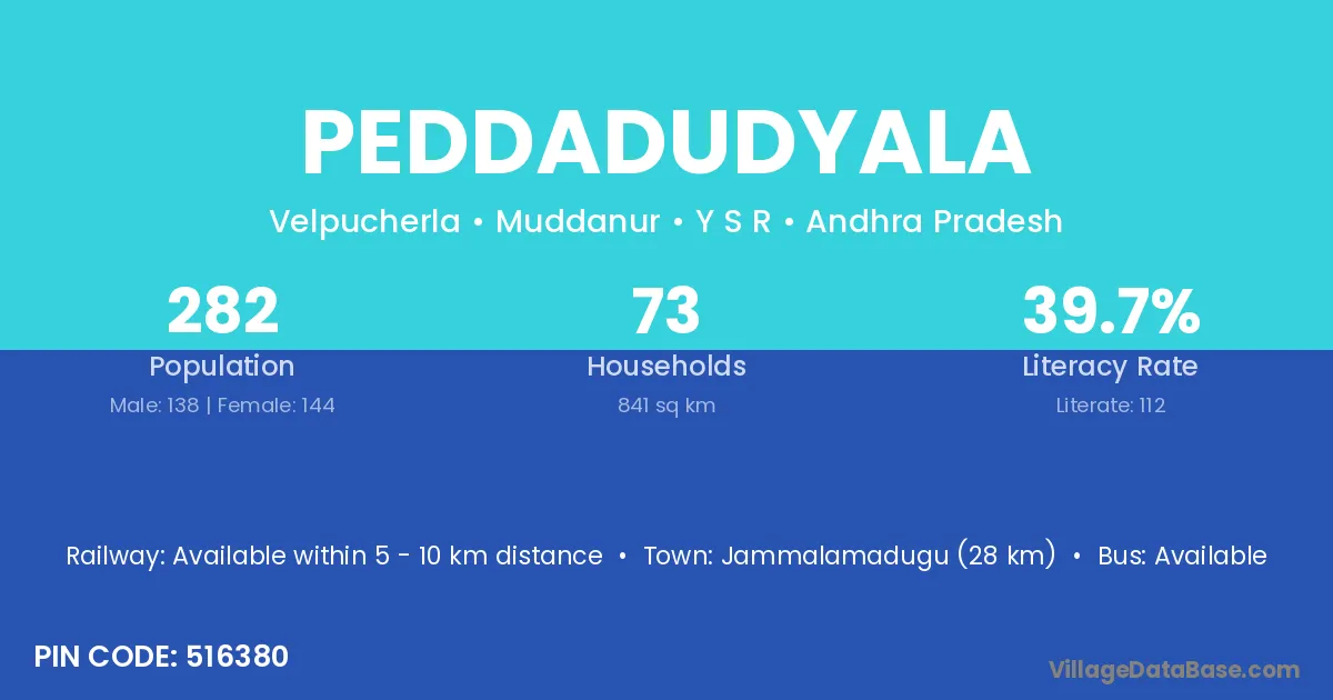 Jammalamadugu (28 km) is the nearest town to Peddadudyala village for major economic activities and is located approximately 28 km away.