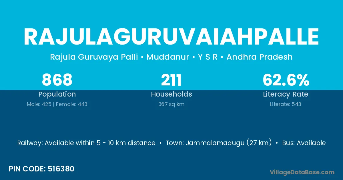 Jammalamadugu (27 km) is the nearest town to Rajulaguruvaiahpalle village for major economic activities and is located approximately 27 km away.