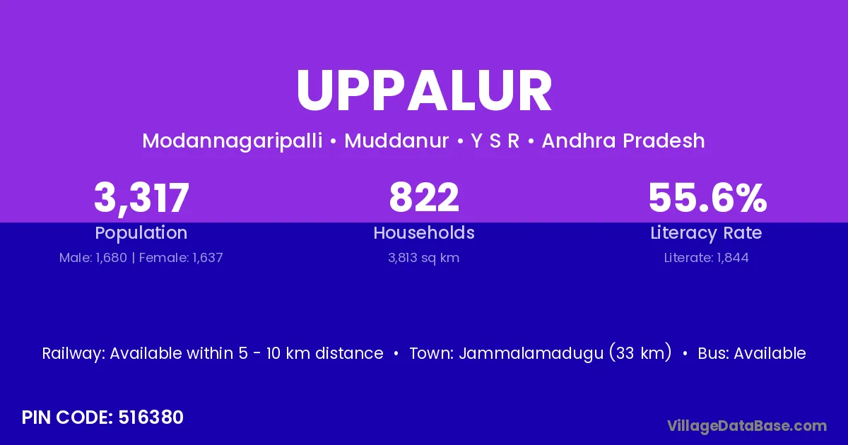 Jammalamadugu (33 km) is the nearest town to Uppalur village for major economic activities and is located approximately 33 km away.