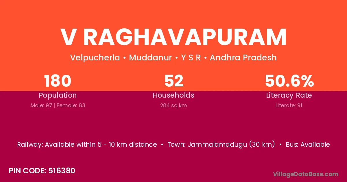 V Raghavapuram village has a total population of 180 people, of which 97 are males and 83 are females.