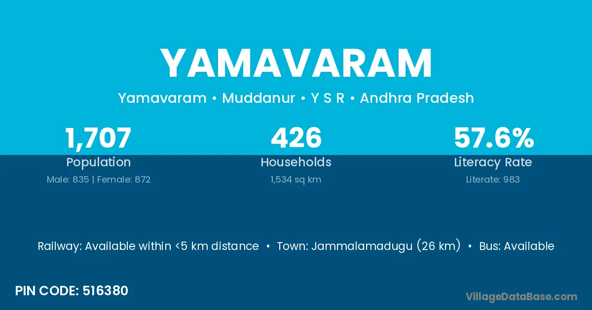 Jammalamadugu (26 km) is the nearest town to Yamavaram village for major economic activities and is located approximately 26 km away.